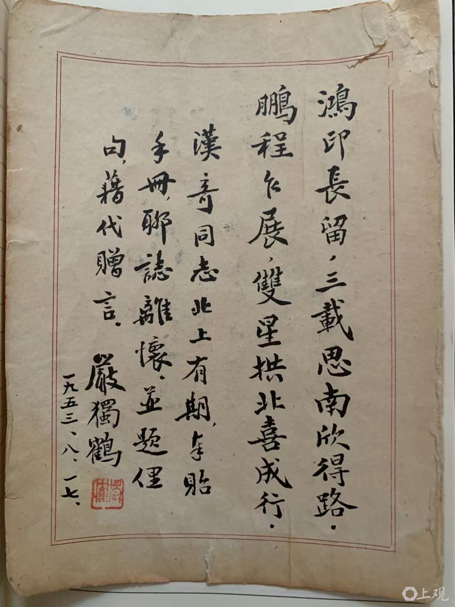 1953年,方汉奇离沪赴京任教,临行前,严独鹤在纪念册上题写赠言。